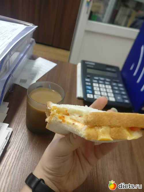 Завтрак: сэндвич с тремя сырами + соленый огурец внутри, торт всего 50 грамм + кофе