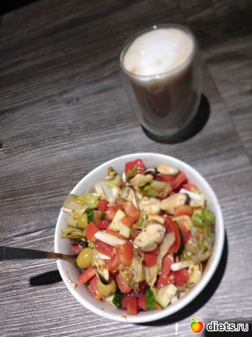 Ужин: овощной салат с морепродуктами в рассоле и капучино домашнего производства, но половину отдала Вадиму