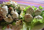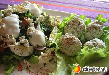 Итальянские сырные шарики с салатом Шарики: в равных долях обезжиренный творог и сыр домашний перемешать, добавить зелени (любой), перец, немного соли и дольку чеснока. Поставить на 1 час в морозилку, далее из массы сделать шарики.