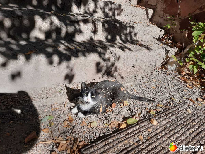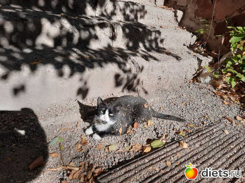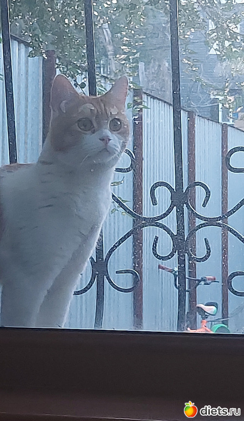А "на десерт" тебе фото нашего дворового кота, который почему-то думает, что мы обязательно должны его пустить к себе в дом Хотя он явно чей-то, чистый, толстый, отказывается даже от мяса Не знаю откуда приходит, но стоит нам зайти на кухню, то он тут как тут) Мордаха такая смешная у него