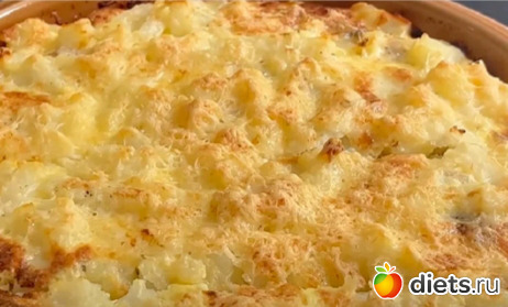 Форму для запекания смазываем сливочным маслом, выкладываем половину отваренного картофеля, не разминая. Он должен остаться ломтиками. Также можно отварить картофель в целом виде, а после этого нарезать или натереть на крупной терке прямо в форму.