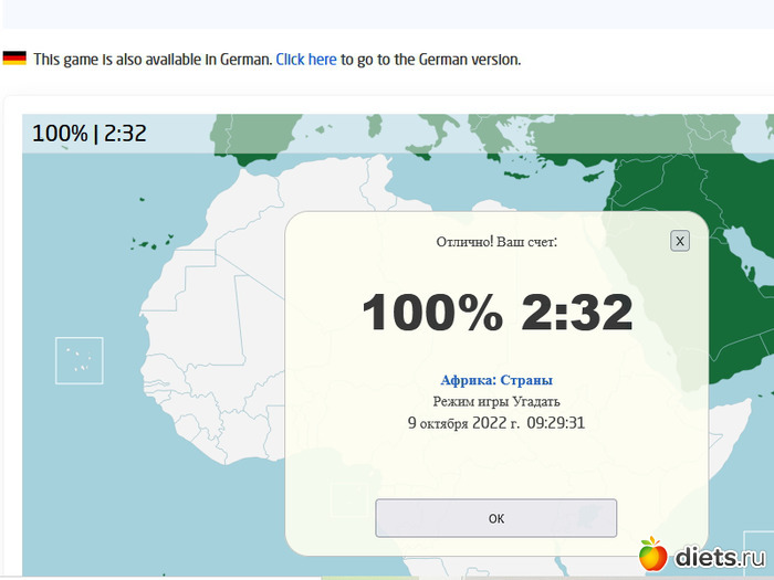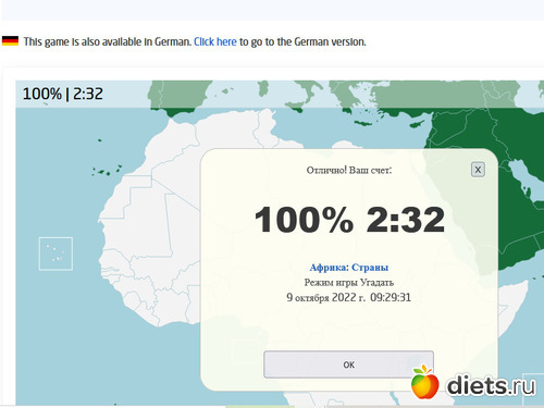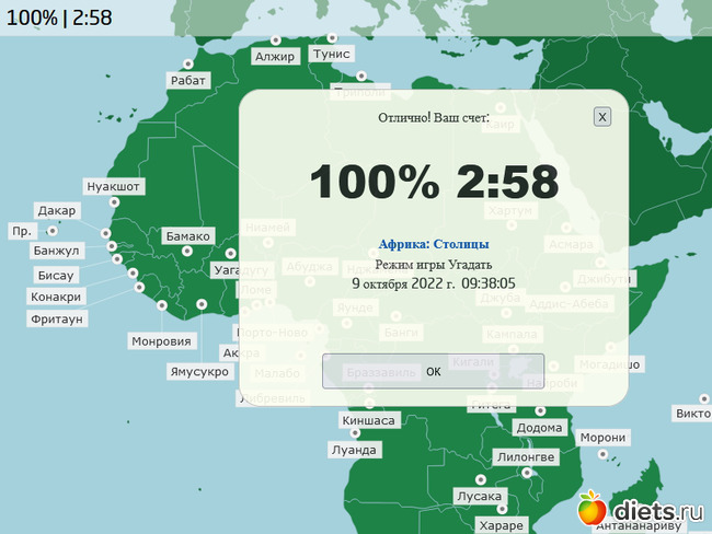 Результат порадовал: 2 мин.32 -страны Африки и 2мин. 58- столицы, без ошибок. Короче, хвастаюсь, какая я молодец!