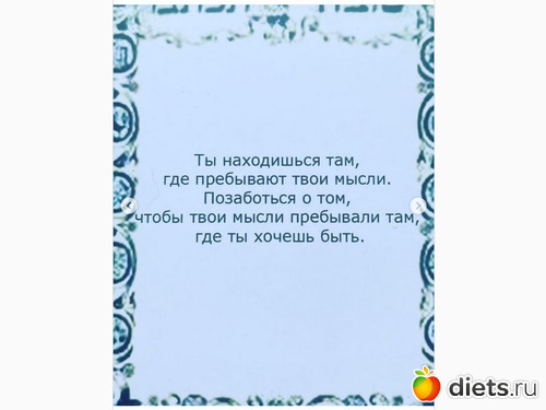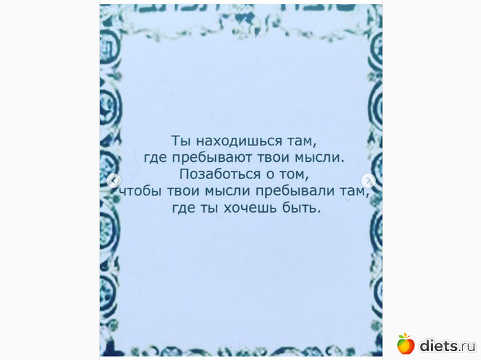 В гадалке от Татьяны Мужицкой мне выпало: "Ты находишься там, где пребывают твои мысли. Позаботься о том, чтобы твои мысли пребывали там, где ты хочешь быть". Раби Нахман