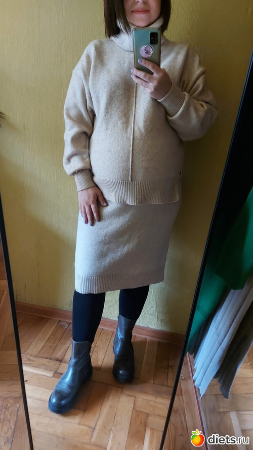 Вот что значит оверсайз - я влезаю во все свои добеременные свитера, кардиганы, жилеты, вязаные платья, вот этот костюм, как и почти всё добеременное, в размере XS