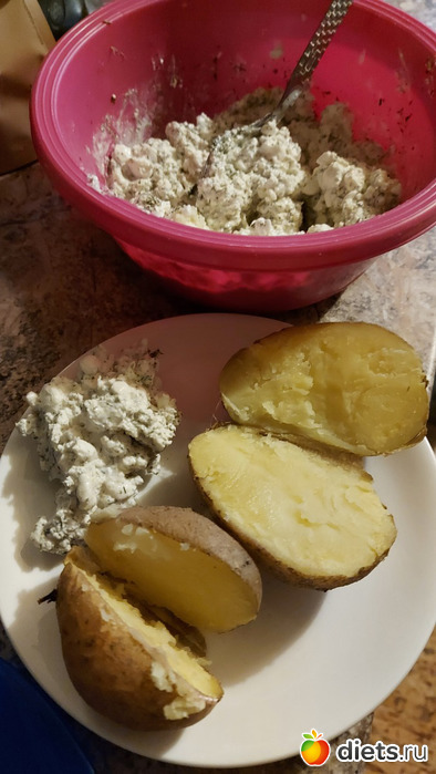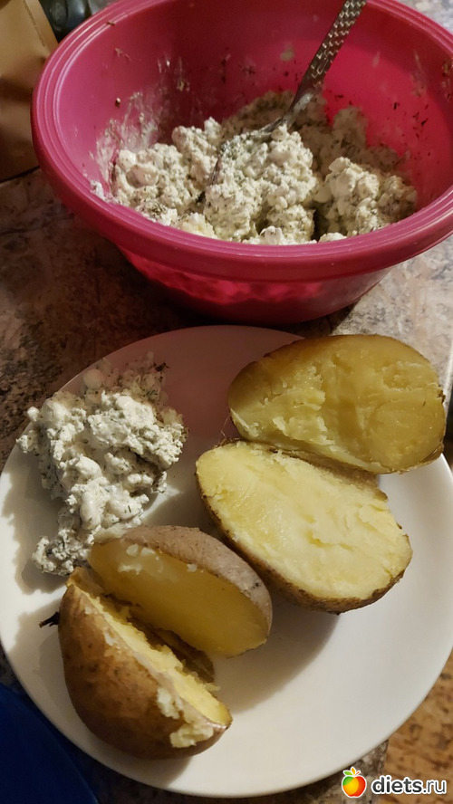 Запеченая в духовке картошка. Соус - зерновой творог+обезжиренный творог+чеснок+укроп+лимонный перец