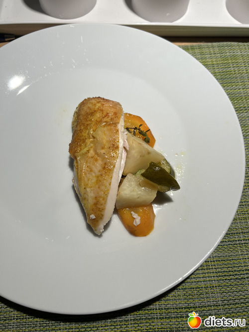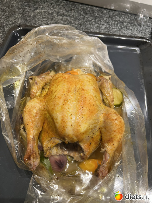 Сто лет пакетом не пользовалась, курица на самом деле нежная, а вот овощи тушеные не моё. На листе вкуснее.