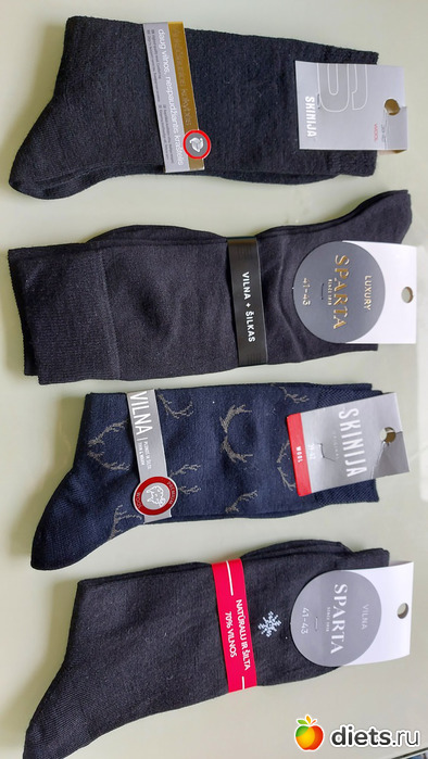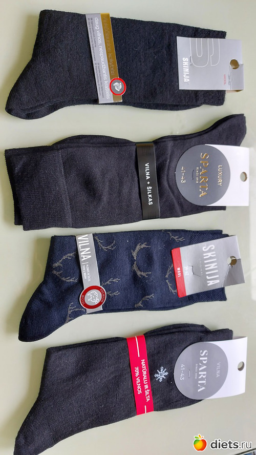 Ну и поскольку впервые за долгие годы зимняя пара у него не на мембране, докупились носки с шерстью в составе. Составы закачаешься, себе такие не беру (дорого): шерсть от 40 до 80 %, одна пара еще и с шелком (70 % шерсть, 20 % шелк, 10 % полиамид). Литовское местное производство