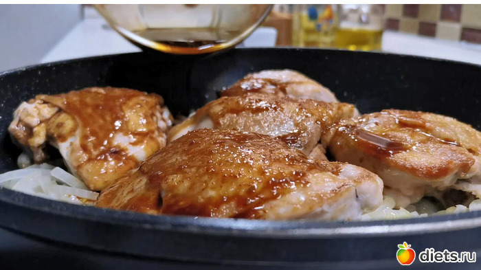Возвращаем курицу в сковороду (выкладываем сверху на лук) и заливаем приготовленным соусом. Даем закипеть, снижаем огонь до слабого и накрываем крышкой. Тушим все это 15 минут.