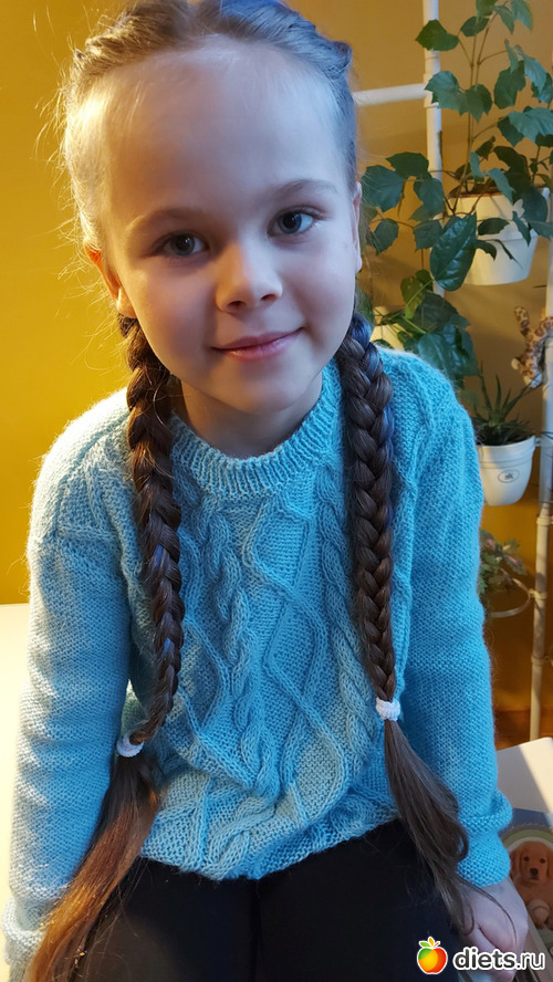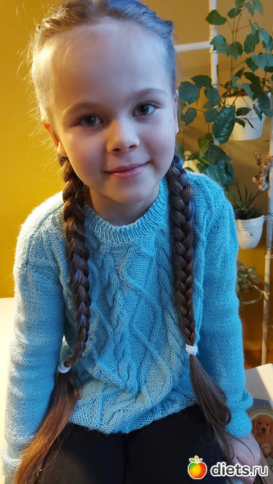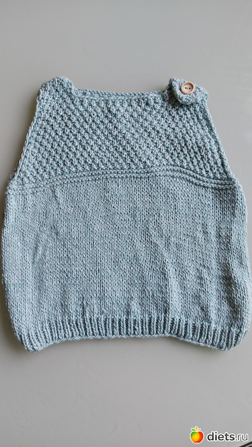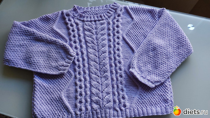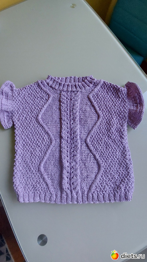 Дочка, насмотревшись на мой сиреневый джемпер, который в посте выше, тоже захотела себе такой. Ей связалась жилеточка похожим узором, 100 % хлопок. Не носилась, продала