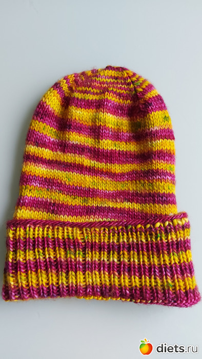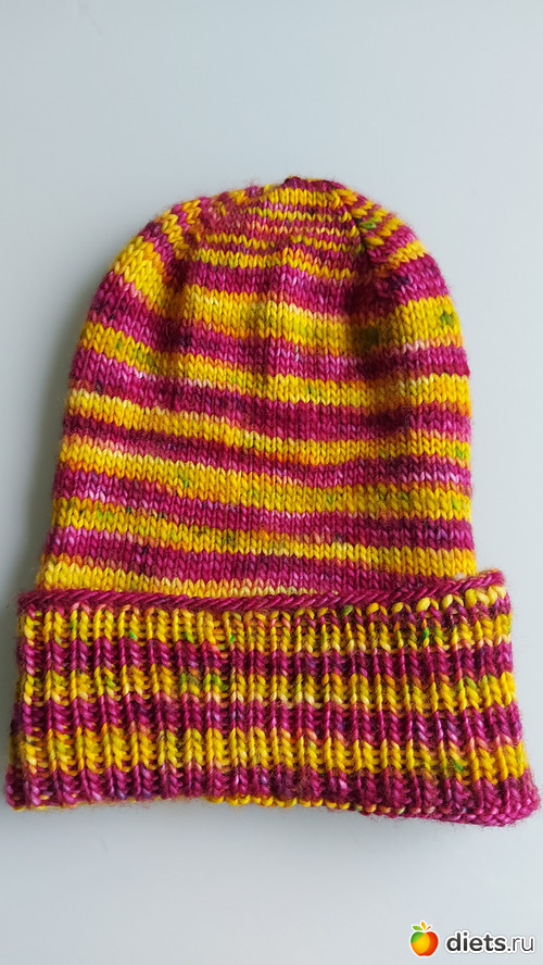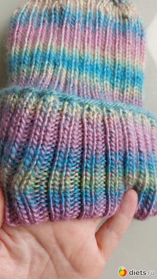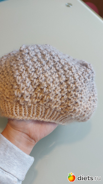 В H&M присмотрела беретик простой, узором рис, молочного цвета. Там конечно чистый акрил висел. Себе связала с градиентом, 80 % меринос, 20 % акрил