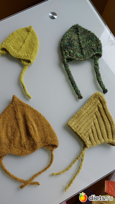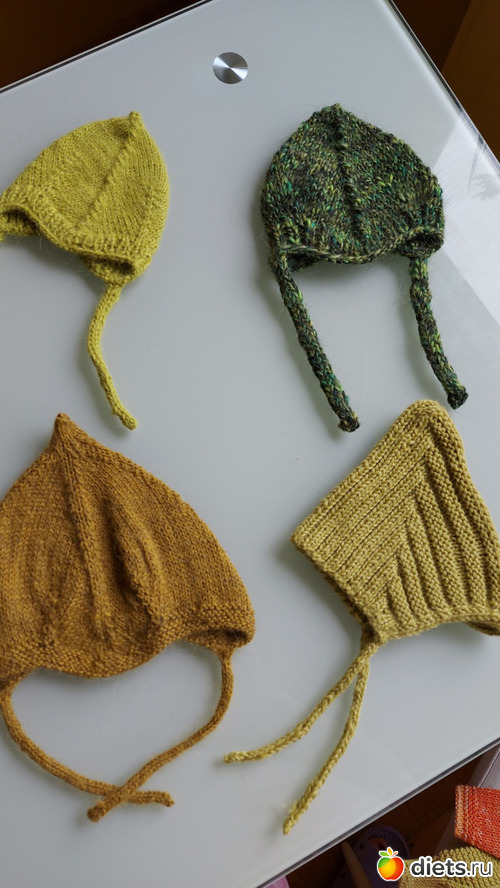 Дальше шапочки. Связала 4, не очень понимала, какой нужен размер. Тут альпака 100 % двойная, одинарная, меринос 100 % и меринос/хлопок 50/50. Подошла в итоге третьего размера, 2 самые маленькие оставили в рд для недоношенных или просто более мелких детей