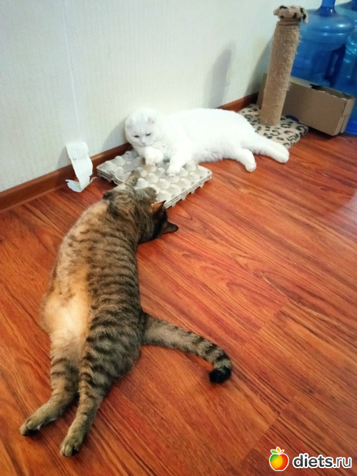 Это она его задирать пришла. А Фима в недоумении )) Посягнула на любимые когтеточки и еще к нему лапы тянет.