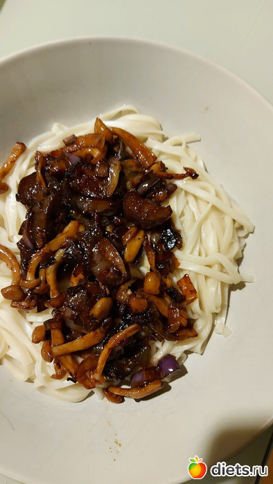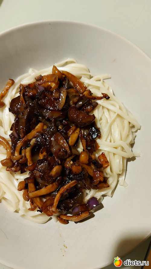 Рисовые макароны с баклажанами и какими-то японскими грибами