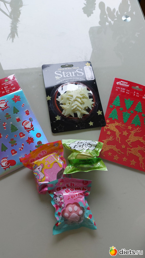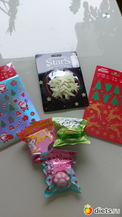 И немножко мелочевки дочке. Наклейки купили на открытку, которую попросили сделать для школы. Светящиеся в темноте звездочки для праздничного декора комнаты. Бомбочки для ванны