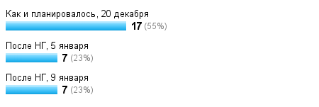 По "графику" новую дуэль "надо" начинать 20 декабря, но тут возникает вопрос - всех ли устраивает эта дата? Создаю опросник, в котором хотелось бы увидеть ваше мнение и когда лучше начать 81ю дуэль. Я ничего страшного в 20 декабря не вижу, плюс на весах почти у всех будет, но зато может будет немного мотивировать слишком много не набрать))))