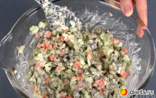 Вместо мяса и колбасы я добавляю в этот салат шампиньоны.