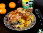 Мандарины/ апельсины режу поперёк колесиками, в латку выкладываю цитрусовые колесики, сверху курицу и в духовку под фольгу. Потом фольгу снимаю и зарумяниваю. Получается курица с цирусовым соусом. Очень необычно и вкусно.