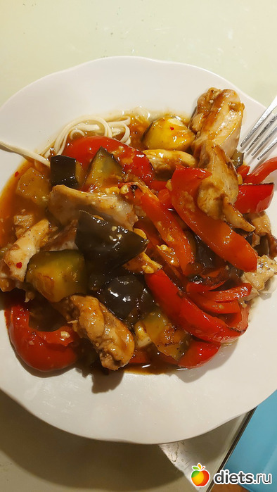 Удон с курогрудью, баклажанами, перцем и соусом чилли