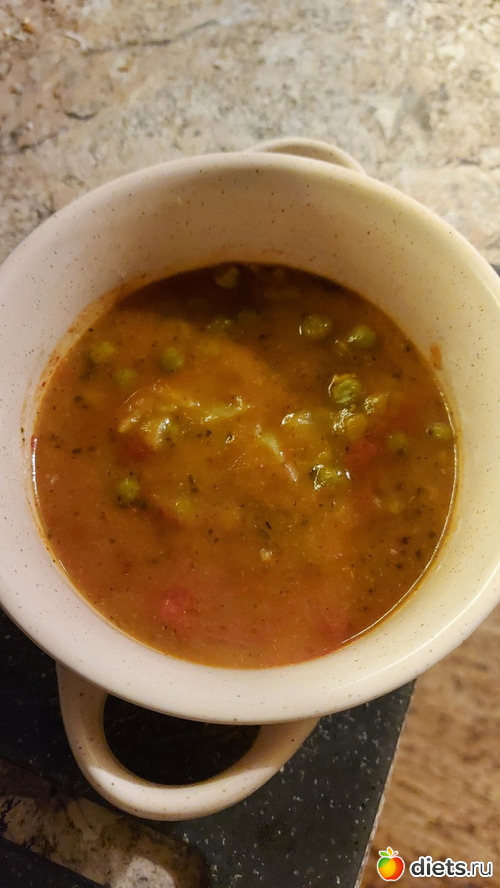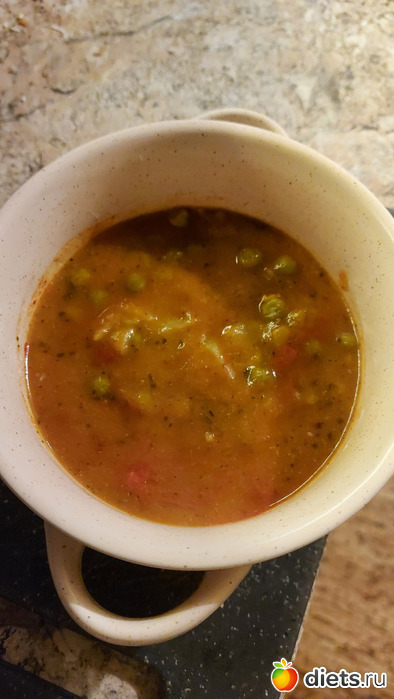 Суп на овощном соке с макаронами из зеленого горошка и с замороженным зеленым горошком