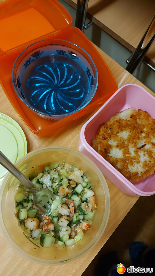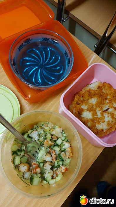 Привез несколько блюд с их праздничного стола: тут салат с креветками, желе и котлеты из рыбы