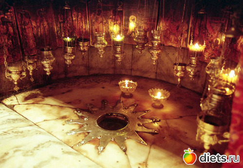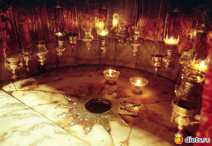 Под базиликой находится пещера, ее место отмечено серебряной звездой с четырнадцатью лучами. Это место Рождения Господа нашего Иисуса Христа.