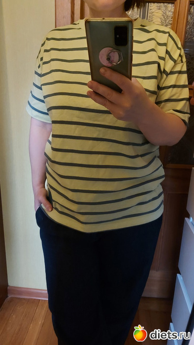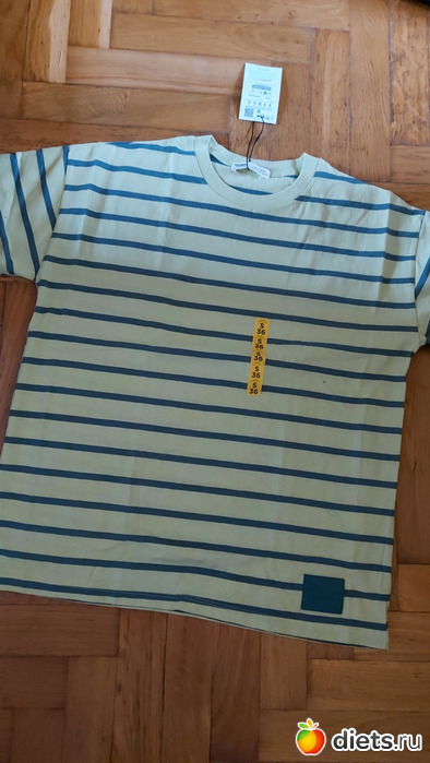 Простая футболка в полоску. Понравилось интересное сочетание цветов: синяя полоска на салатовом фоне