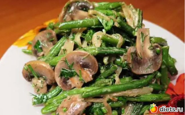 Отправляем лук к фасоли и грибам, и даём всему этому делу остыть минут десять.