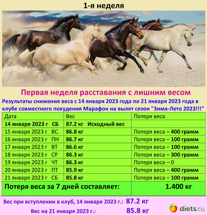 Результаты снижения веса с 14 января 2023 года по 21 января 2023 года в клубе совместного похудения Марафон на вылет сезон "Зима-Лето 2023!!!"