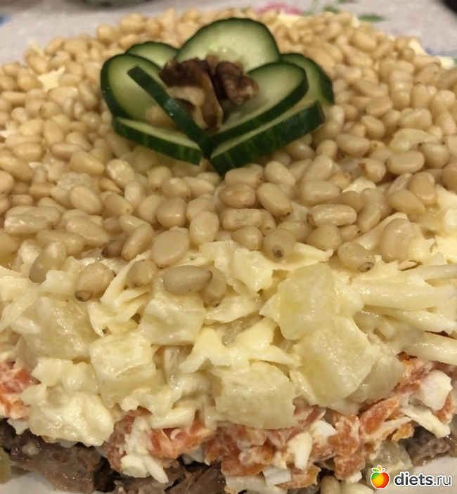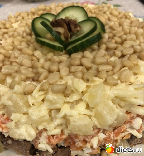 Выкладываем слоями и украшаем орехом. Можно украсить огурцом или морковкой.