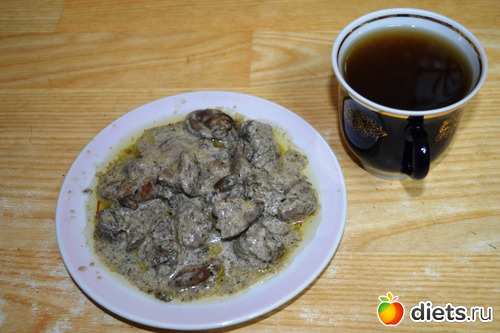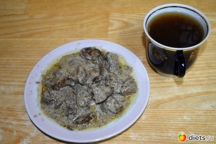 У меня тушёная куриная печень с сухими грибами со сметаной.