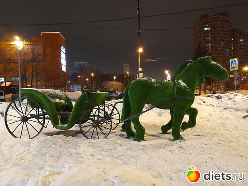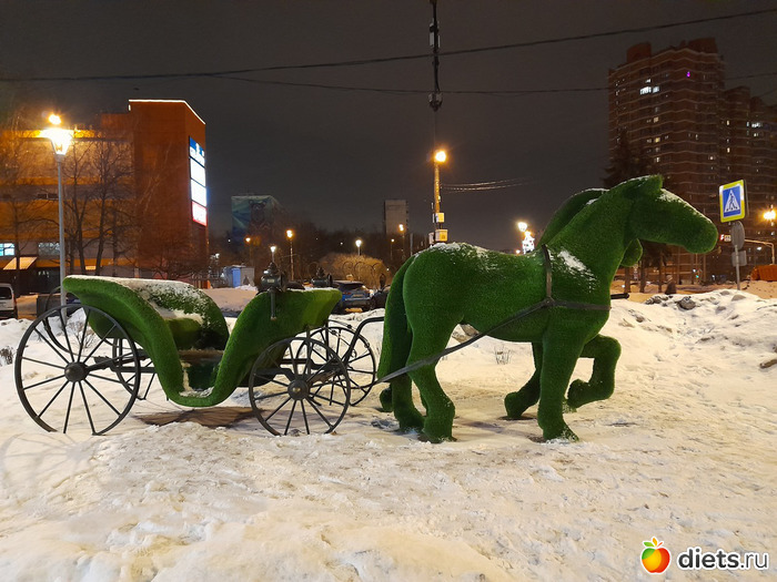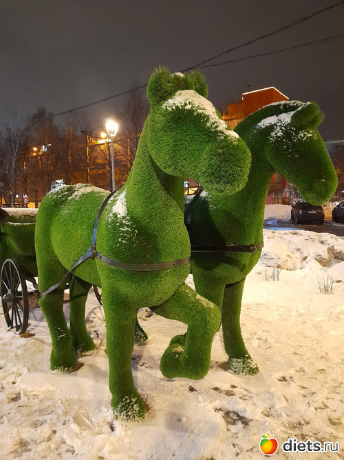 Эти фигуры зеленых коней, выполненные в стиле «топиар» стоят на улице Миклухо-Маклая.