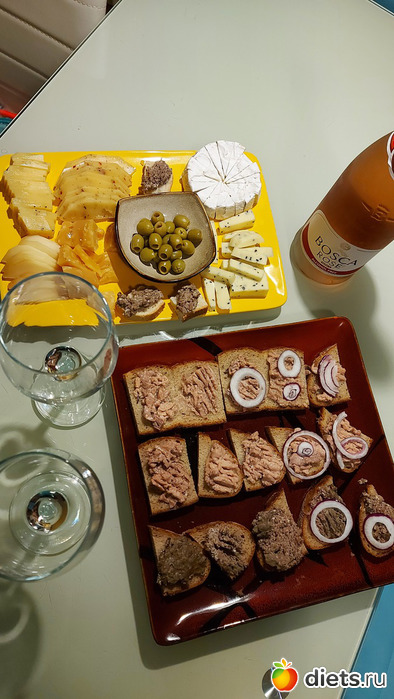 Б/а шампанское, сырная тарелка, оливки, бутеры с печенью трески и печенью гуся
