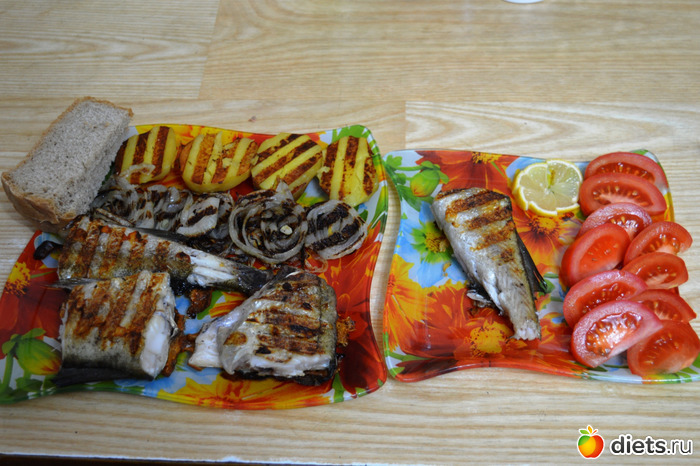 Но зато хлеба положила в два раза меньше. Минтай, запечённый на гриле, с луком и картофелем - у мужа, у меня - с помидоркой и лимоном.
