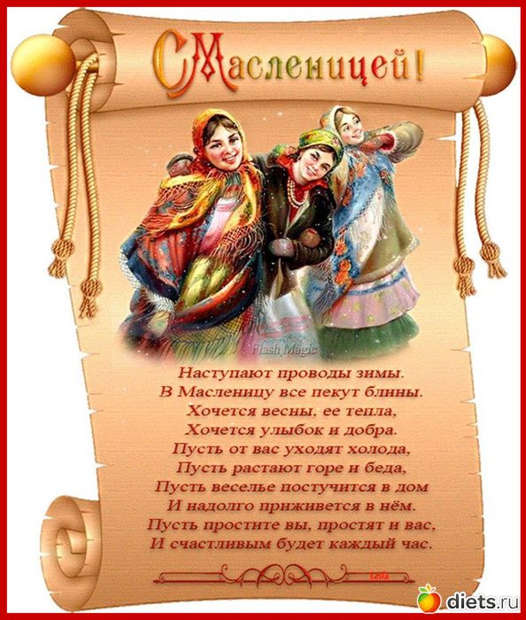 От души поздравляю всех с ожидаемым и любимым в народе праздником — Масленицей! Отныне Зима сдает свои права Весне. Хочется пожелать всем, чтобы жизнь была такая яркая, насыщенная, благополучная, как эта замечательная неделя. Пусть здоровье будет в порядке, а жизненные силы бьют ключом!