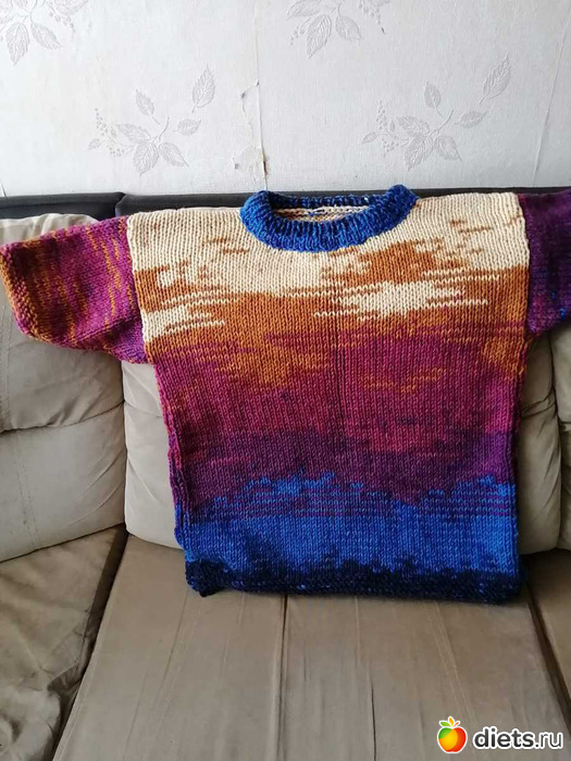 Вспомнила, как в 2000 году вязала сыночку старшему свитер из обрывков-остатков. Распускала старые папины черные носки (верх), они из толстеньких ниток были, и ещё какие-то негодные уже вещи, чередовала черные и цветные ряды. Классно вышло...
