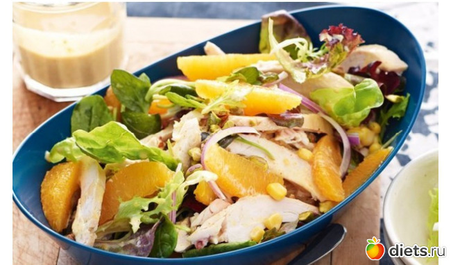 2. Апельсины нарежьте на ломтики, сохраняя сок. Переложите в большую миску. Добавьте к апельсинам кукурузу, зелень, нарезанный полукольцами лук и курицу.