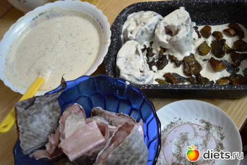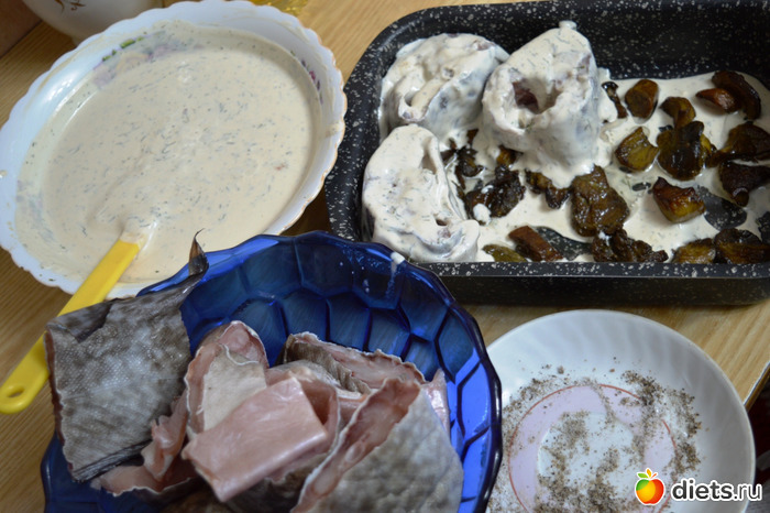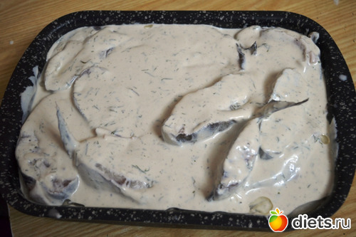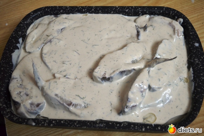 Смешала: сметану, укроп, подсолнечное масло, соль, чёрный перец, горчицу, соус Терияки (можно обычный соевый, но мне больше нравится Терияки, не такой солёный и вкусный). Кусочки рыбы натёрла смесью соли и перца. Смазала форму немного маслом и окуная в соус рыбку, выложила в неё. Соуса я сделала много.