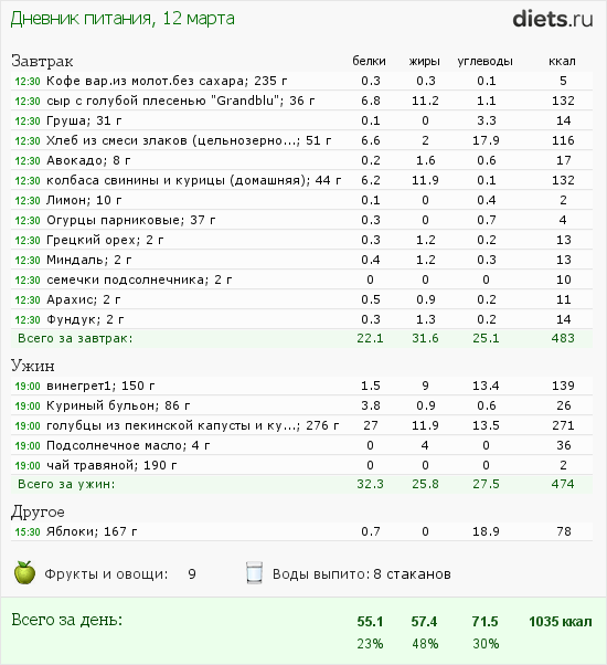 Сегодня опять маленький минус. Хотя его я не ожидала, было мало шагов. Но много белка. Я уже заметила, что на белке, у меня, вес хорошо уходит. Не раз разгруз делала на курице - всегда хороший минус.