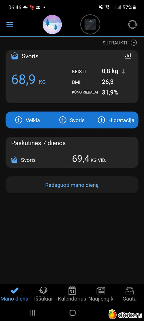 Вес на сегодня кг 68.9 кг, в предыдущий замер было на 800 г больше, среднее за 7 дней 69.4 кг, жЫр 31,9 %, имт 26.3.