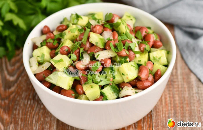 10. Нежная фасоль прекрасно сочетается с хрустящими огурцами и луком. Заправка дает отличный аромат и вкус. Салат в меру острый и очень-очень вкусный.