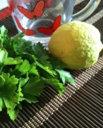 Сначала помоем петрушку и оторвем листики, так как ножки нам не нужны, кладем их в блендер. Выжимаем сок одного лимона и отправляем к петрушке.