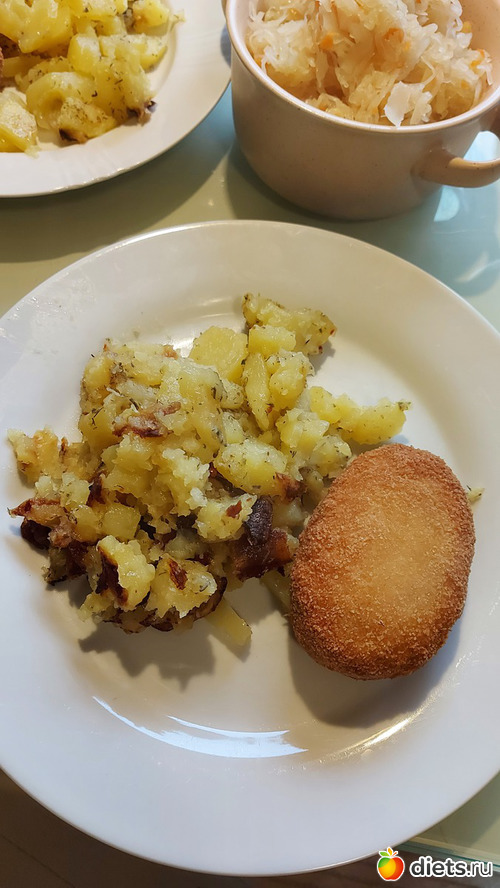 Куриные котлеты с начинкой из ветчины и сыра, покупала готовыми в супермаркете. Картошку пожарил старший сын в мультиварке. Квашеная капуста
