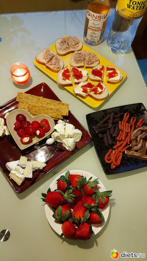 Бутеры с икрой и печенью трески, сыры, фаршированые перчики, говяжья вяленая колбаса, свиные кабаносы с сыром, свиные копченые уши, крекеры, безалкогольный джин и тоник обычный, клубника. Всё свиное - мне, он не ест