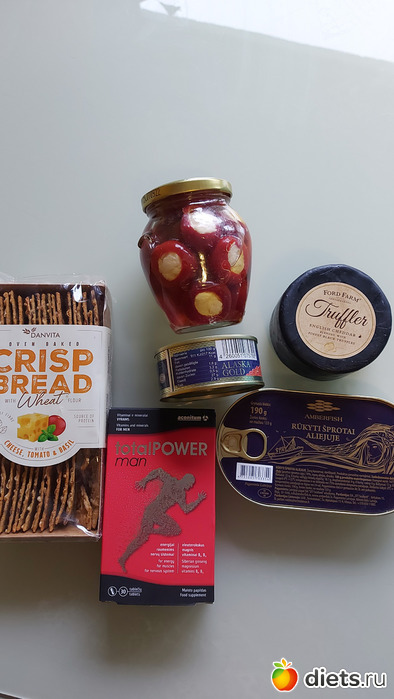 (хлебцы, икра, фаршированые перчики, шпроты, сыр с трюфелем, витамины)