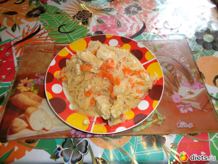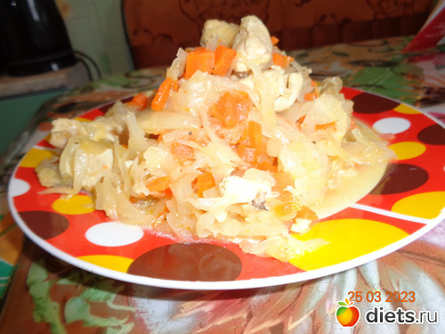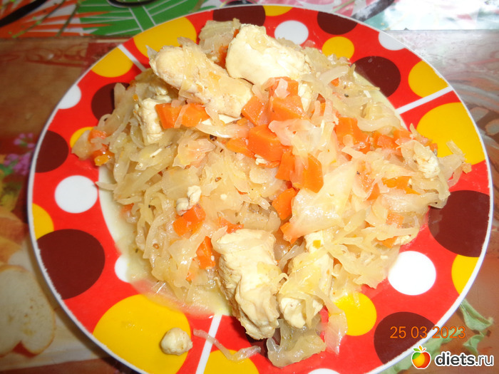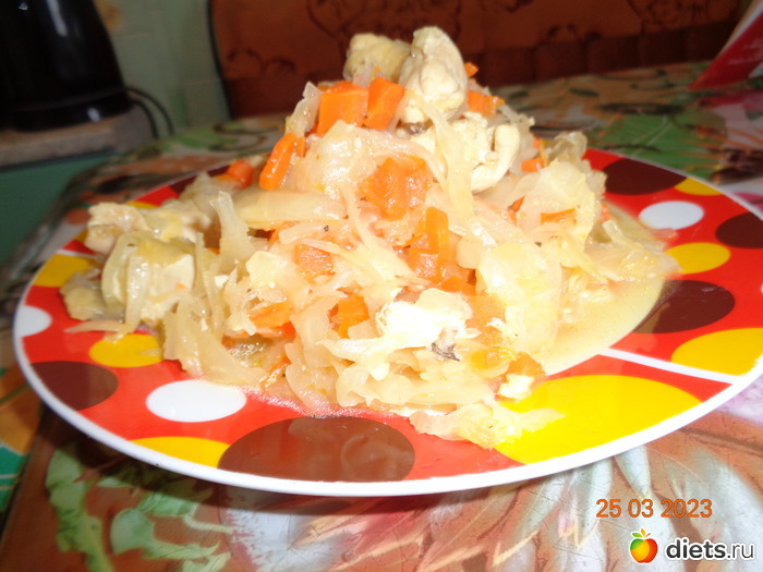 7. Добавляем к мясу капусту и заливаем один мультистакан воды. На мультиварке устанавливаем режим «Плов». В основном программа сама должна рассчитать время приготовления, но если этого нет, то вручную устанавливаем время один час.