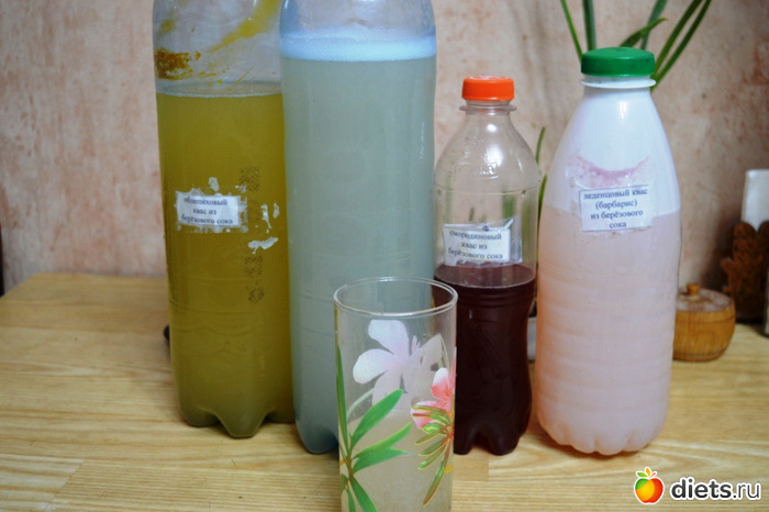 Муж принёс с погреба берёзовый квас. В прошлом году я "расширила" ассортимент. Раньше делала: лимонный, апельсиновый с мятой, с сухофруктами. Добавила - смородиновый, облепиховый, леденцовый (барбарис) и оставила лимонный. Из новых всем очень понравился облепиховый, а мне ещё смородиновый. В квасе есть какой-то процент алкоголя, но такое малое количество нам нечем определить. Я думаю 2-3 градуса, муж говорит 6. Вкусно!