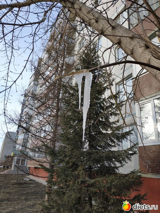 , увидела вот такое чудо, практически у себя под балконом - сосульки на дереве. Откуда? Причём только на одном, на клёне.