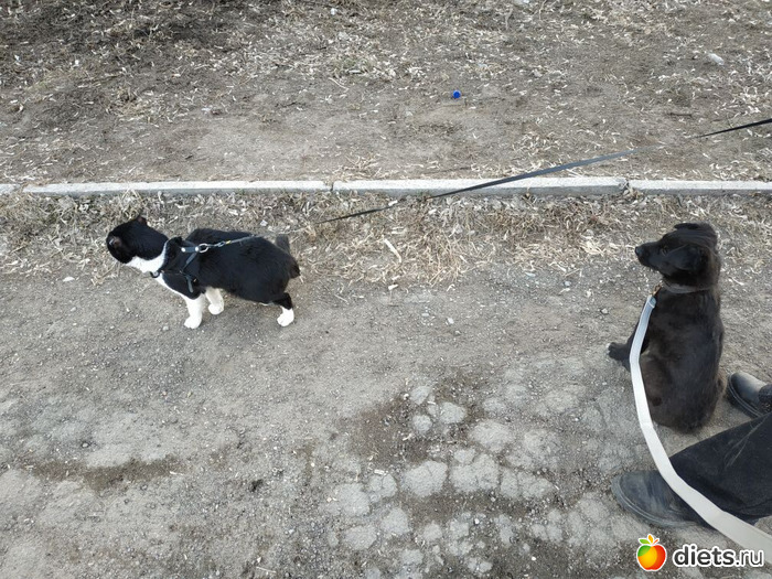 Благодаря нашим товарищам, гуляем много и часто. Дюша, пока, старается от ног хозяина не отходить, если отходит, то только к Лёве. Громкий звук и с визгом, плачем - к хозяину, жаловаться