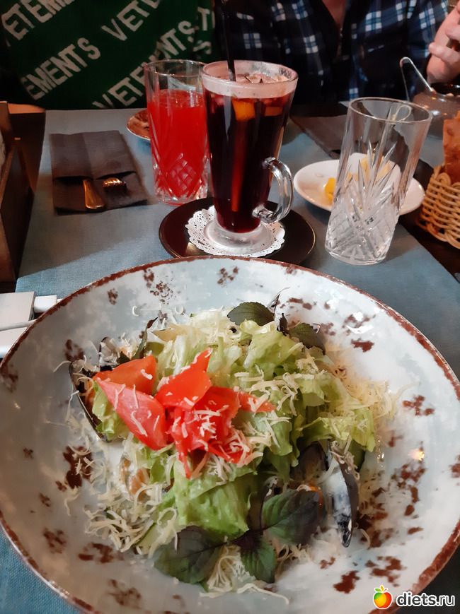 Я же разошлась, конечно же. Тёплый салат с морепродуктами (это уже традиционно), томлёная свинина на луковой подушке, глинтвейн на красном вине. Понятно, что компанию мне никто не составил)))