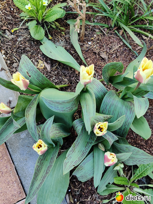 Раскрылись первые тюльпанчики, они как звёздочки в солнечный день, а когда дождик или пасмурно стоят закрытые